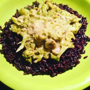 Riz noir accompagné d’une sauce aux brocolis, olives vertes et parmesan
