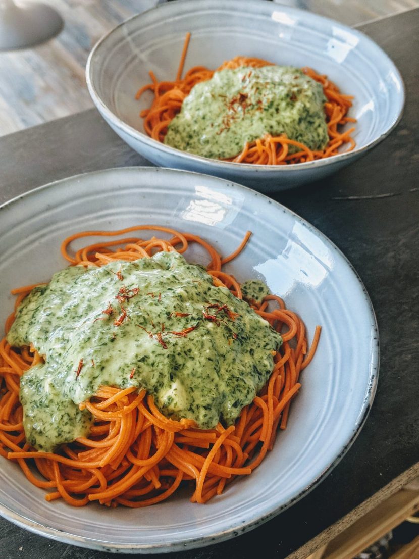 - Une fois les spaghettis cuits, dresser les assiettes. Ajouter dans un premier temps, les pâtes puis verser la crème de mâche sur le dessus.