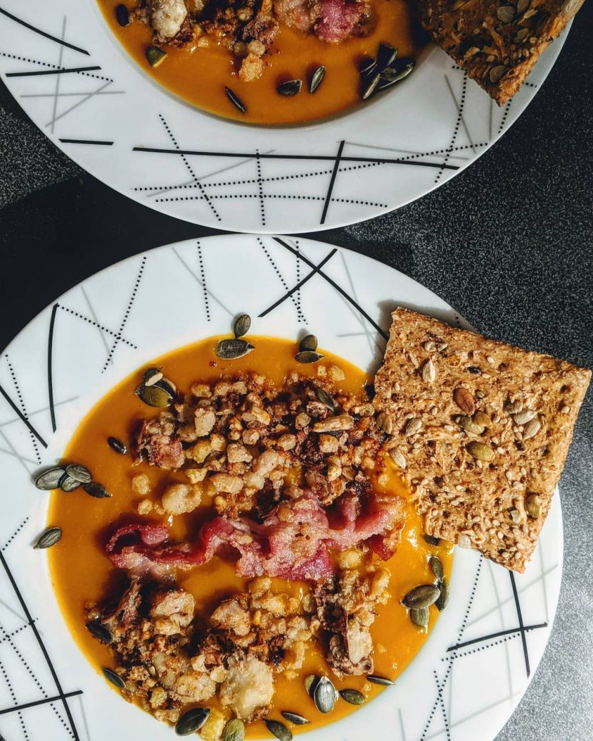 7) Il est temps de dresser ! Verser le velouté dans des assiettes creuses, ajouter la tranche de lard grillé/les châtaignes ainsi que les graines de courge et un cracker aux graines.